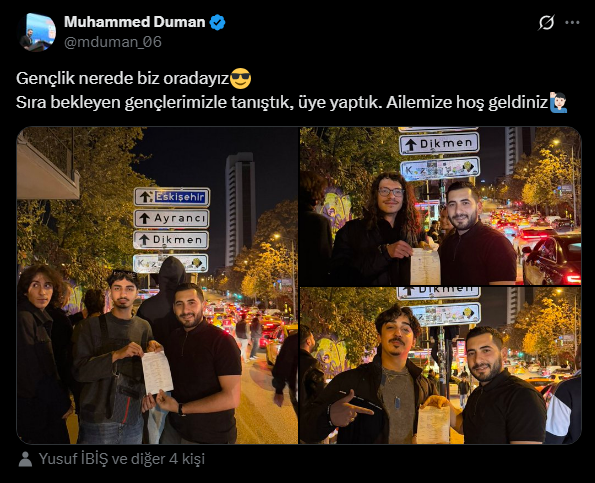 Tabelanın önünde oluşan kalabalığı fırsat bilen AKP Çankaya İlçe Gençlik Kolları ise, gençlerle “tanışma” bahanesiyle siyasi faaliyette bulundu. İlçe Gençlik Kolları Başkanı Muhammed Duman, sosyal medya hesabından yaptığı paylaşımda, “Gençlik nerede biz oradayız. Sıra bekleyen gençlerimizle tanıştık, üye yaptık. Ailemize hoş geldiniz” ifadeleriyle fotoğraflar paylaştı.